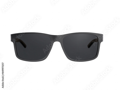 Pair of modern sunglasses with dark matte rectangular frame and polarized lenses on transparent background