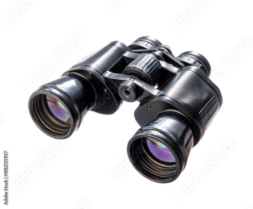 Pair of old black binoculars with reflective coated lenses and a textured surface is shown in a detailed studio shot, representing observation, exploration, and surveillance
