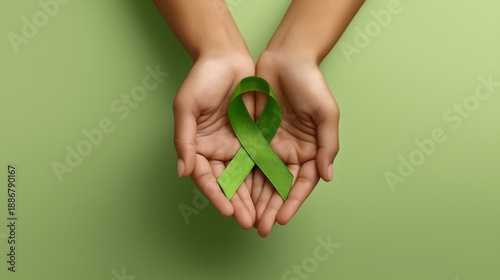 Pair of olive skin hands holding a green ribbon on a light background