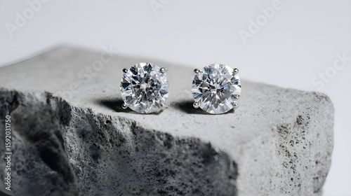 Pair of sparkling diamond earrings resting on rough stone