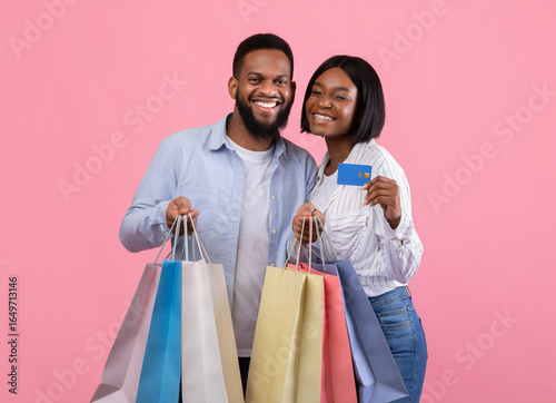 Pair of sweethearts shopping for Valentine's Day, holding gift bags and credit card, promoting contactles payment, pink background. Millennial black couple buying presents on web