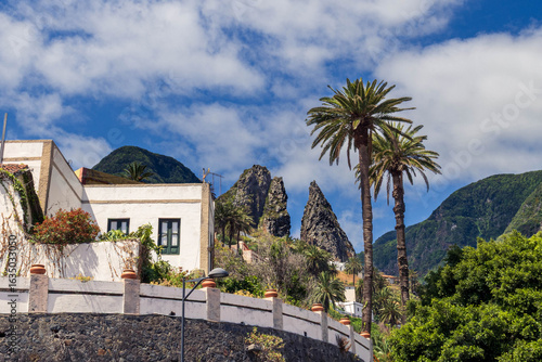 Paisaje tropical con palmeras altas y cielo azul con nubes en un pueblo de La Gomera, España