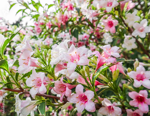Pale pink flowers of Weigela Florida Variegata. Floral background
