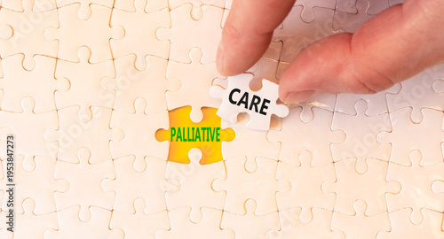 Palliative care words symbol. Concept words Palliative care on beautiful white puzzles. Beautiful yellow background. Doctor hand. Medical and Palliative care words concept. Copy space.