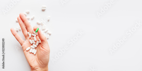 Palm hand full of white and green one scattering pills. Capsules with medicines on light background. Flat lay, top view.