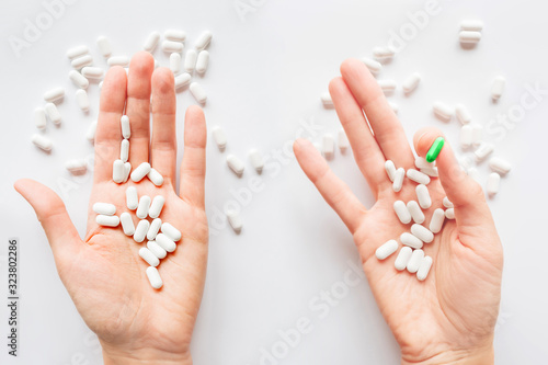 Palm hands full of white and green one scattering pills. Capsules with medicines on light background. Flat lay, top view.