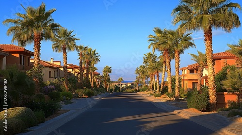 Palm-lined street, desert homes, sunset view, luxury real estate