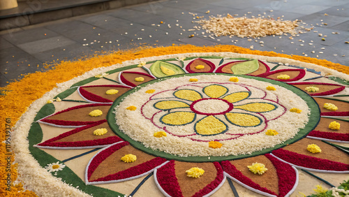 Panagyaman rice festival celebration with colorful floral rangoli design for festive decor.
