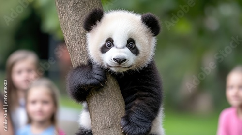 Panda cub in a tree, kids watching