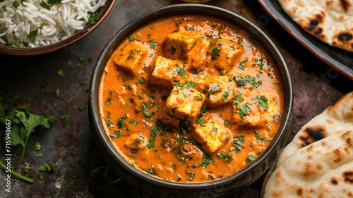 Paneer Butter Masala or Cheese Cottage Curry in serving a bowl or pan, served with or without roti and rice