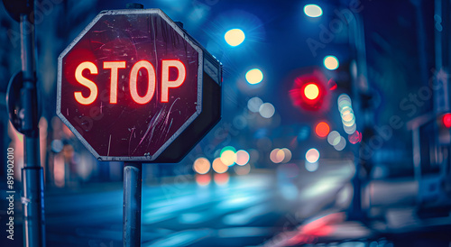 Panneau routier STOP. Sur le fond flou de la ville nocturne.