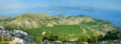 Panorama from the top of Mount Pantokrator to the sea and the mountainous mainland with Albania.