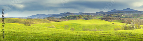 panorama landscape with green fields under clouds in Tuscany in Italy