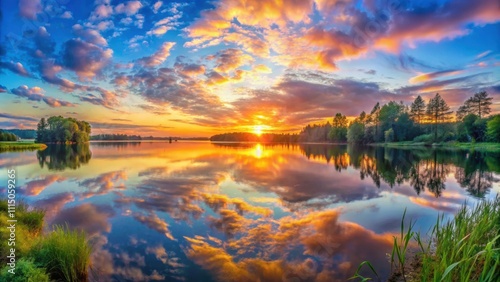 Panorama of a breathtaking sunrise over a tranquil lake, sunrise, lake, water, reflection, majestic, stunning, peaceful