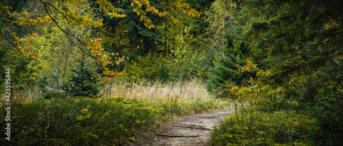 Panorama of path in autumn forest at daytime