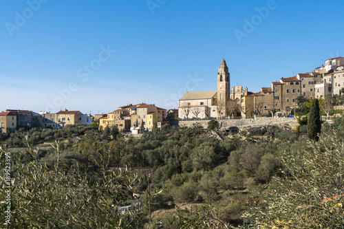 Panorama of the small town of Cipressa (Liguria, Italy), surrounded by olive trees cultivation. Typical Italian country village overlooking the Mediterranean sea, Ligurian Riviera.