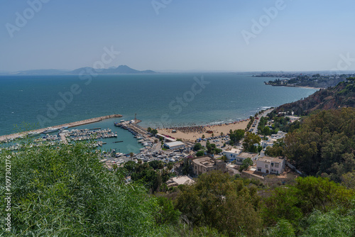 Panorama seen from a high mountain over the sea with a small port and beach