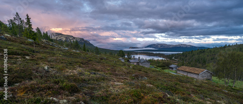Panorama shot of old abandoned farm houses lakes, mountains and dramatic skies in the norwegian mountains. .Outdoors and landscape concept.