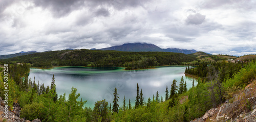 Panoramic Beautiful View of Emerald Lake during a cloudy summer day. Located near Whitehorse, Carcross, Yukon, Canada. Nature Background Panorama