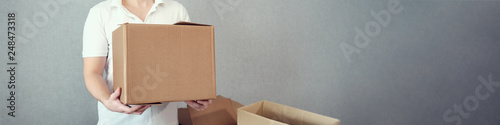 panoramic image of unknown man holding cardboard boxex in his hand, copy space