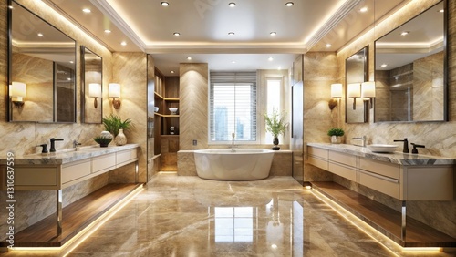 Panoramic Modern Beige Marble Bathroom Design, Tiled Floor, Luxury Spa Interior