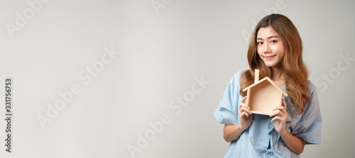 Panoramic portrait of young beautiful Asian woman holding the wooden house model feeling happy and joyful with the copy space, concept of life insurance, sick recovery, health insurance program.