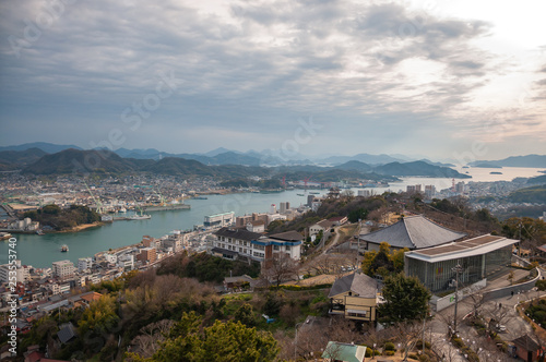 Panoramic, scenic view of Onomichi City and the Seto Inland Sea during sunset as seen from the Senkoji Park Observatory which is located on the summit of Mt. Senkoji in Hiroshima Prefecture in Japan.