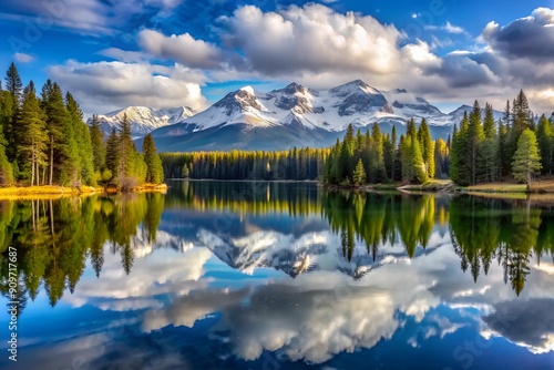 panoramic view of a lake with reflection, a forest and snowcapped mountain in the background