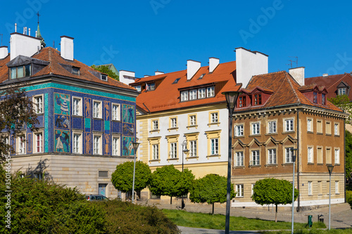 Panoramic view of historic, richly decorated colorful tenement houses at Bugaj, Mostowa and Brzozowa streets of Starowka Old Town quarter in Warsaw, Poland