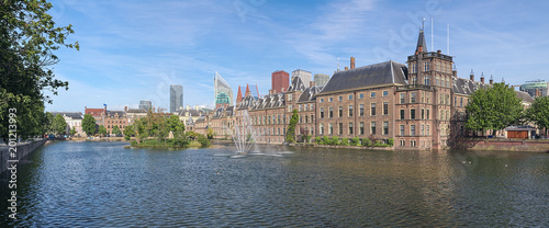 Panoramic view of Hofvijver Pond (Court Pond) with Binnenhof complex in The Hague, Netherlands