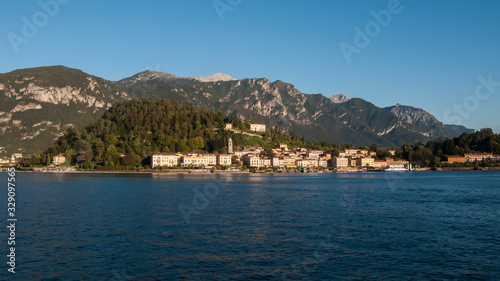 panoramic view of Lake Como, the Alps and the city of Bellagio from the ferry, Lake Como, Italy