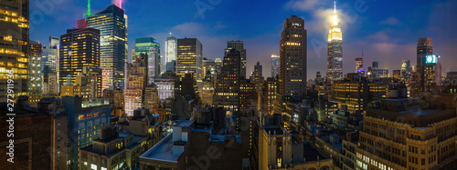 Panoramic view of Manhattan skyscrapers lights, New York city, in the evening