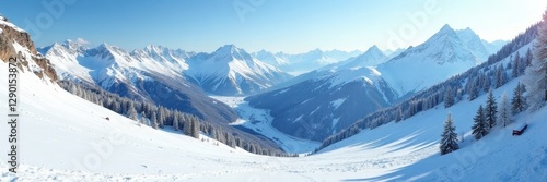 Panoramic view of snow-covered ski slopes in mountainous terrain , white, winter wonderland