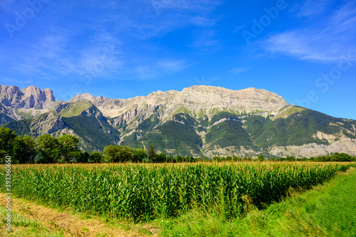 Panoramic view on Breche de Faraut mountain range in French Prealps in summer