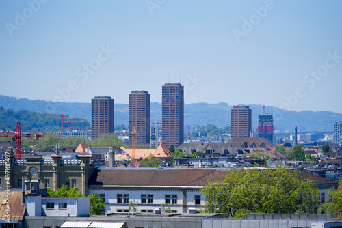 Panoramic view over City of Zurich at sunny summer day with skyscrapers. Photo taken June 1st, 2021, Zurich, Switzerland.