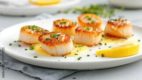 Pan-seared scallops served with a lemon sauce and microgreens.