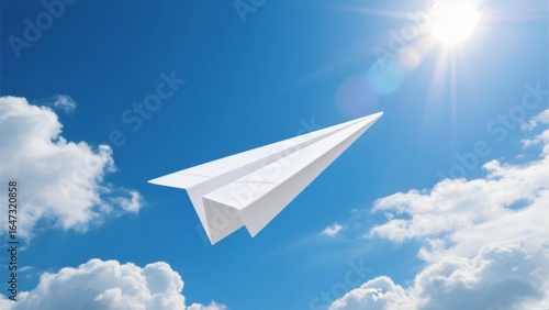 Paper airplane soaring through a bright blue sky with fluffy clouds and sunlight