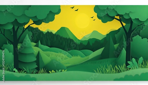Paper art style of green trees and grass landscape with copy space for text decoration, green environment concept for World Earth Day or ecology theme background vector illustration.