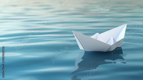 Paper Boat Floating Gently on Calm Blue Water Reflecting the Sky, Symbolizing Dreams, Childhood Memories, and Peaceful Journeys on a Serene Aquatic Surface