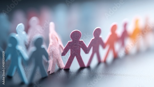 Paper chain of diverse people holding hands. Teamwork, unity, and community.