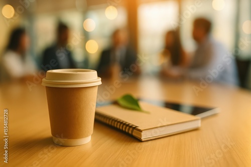 Paper coffee cup in front of a notebook with leaf on desk, blurred background shows group in office meeting