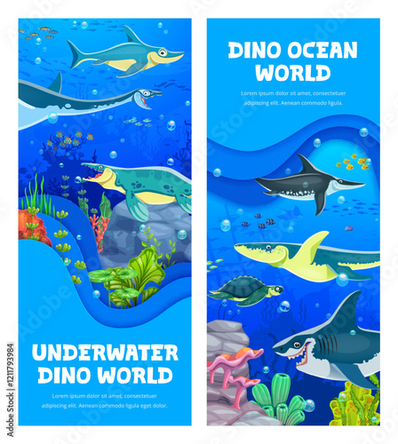 Paper cut banners with underwater prehistoric dinosaur characters. Ocean extinct dinosaurs reptiles vector posters with ophthalmosaurus, elasmosaurus, tylosaurus and ichthyosaur, kronosaurus, archelon