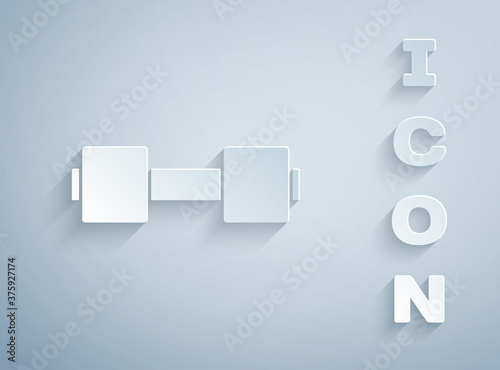 Paper cut Dumbbell icon isolated on grey background. Muscle lifting icon, fitness barbell, gym, sports equipment, exercise bumbbell. Paper art style. Vector.