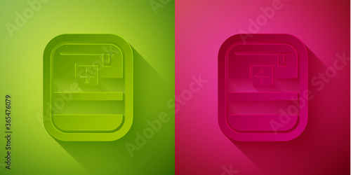 Paper cut First aid kit icon isolated on green and pink background. Medical box with cross. Medical equipment for emergency. Healthcare concept. Paper art style. Vector Illustration.
