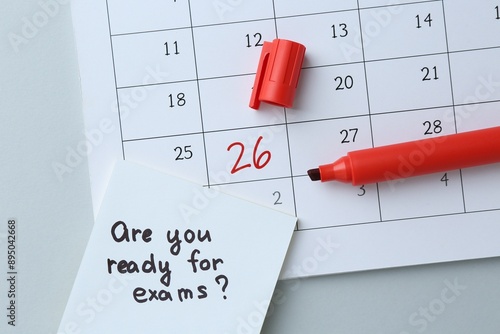 Paper note with question Are You Ready For Exams and stationery on grey background, flat lay