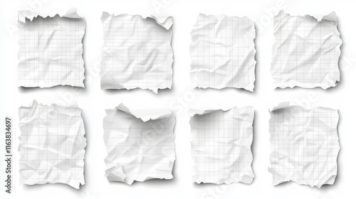 Paper pieces with wrinkles and torn edges. Realistic vector illustration set of empty white, lined and checkered pages with crumpled effect. Design mockup of blank sheet with crease and rough border.