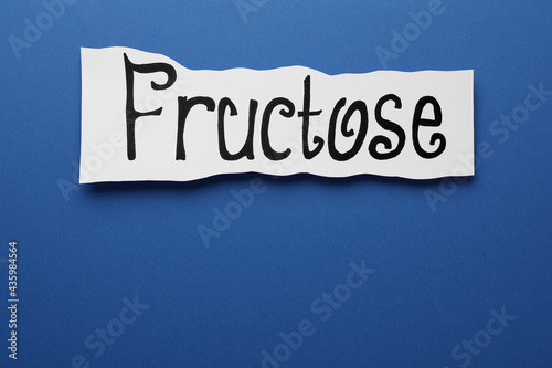 Paper sheet with word Fructose on blue background, top view. Space for text