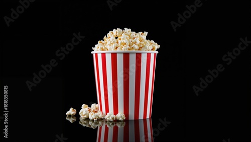 Paper striped bucket filled with popcorn used as a TV or cinema snack, emphasizing portion size and presentation, World Popcorn Day