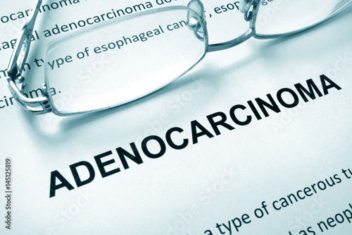Paper with word adenocarcinoma and glasses. Medical concept.