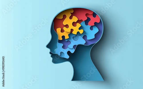 paper-cut head silhouette filled with colorful interlocking puzzle pieces representing a thoughtful, creative and complex mind